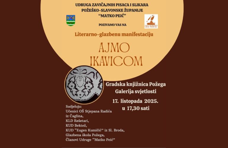 Udruga zavičajnih pisaca i slikara Požeško-slavonske županije „Matko Peić“ poziva sve ljubitelje pisane riječi i glazbe na literarno-glazbenu manifestaciju „Ajmo ikavicom“.