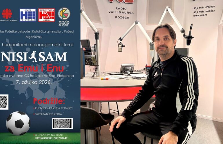 Caritas Požeške biskupije organizira 15. tradicionalni humanitarni malonogometni turnir “Nisi sam“, u suradnji s Katoličkom gimnazijom u Požegi. Turnir će se održati u subotu, 7. ožujka u sportskoj dvorani Osnovne škole fra Kaje Adžića u Pleternici. Naš današnji gost bio je Mario Raguž, profesor na Katoličkoj gimnaziji u Požegi, koji je najavio turnir.