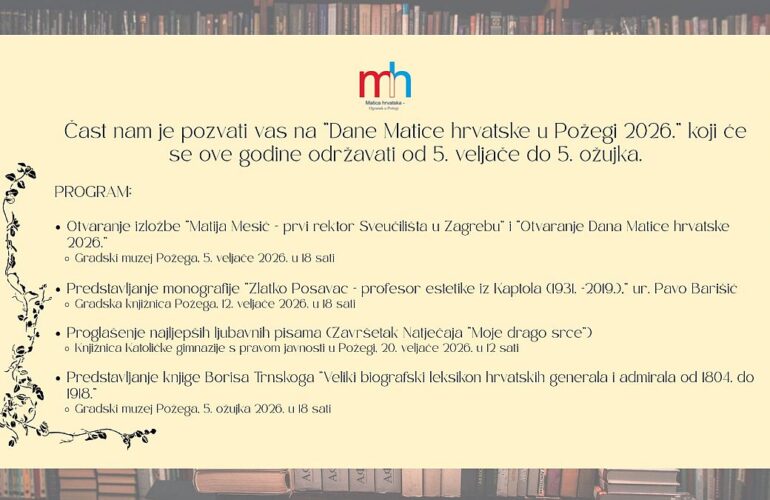 Matica hrvatska – Ogranak u Požegi poziva građane na Dane Matice hrvatske u Požegi 2026., koji će se ove godine održavati od 5. veljače do 5. ožujka 2026. godine. Program obuhvaća niz kulturnih i književnih događanja posvećenih hrvatskoj povijesti, znanosti i pisanoj riječi.