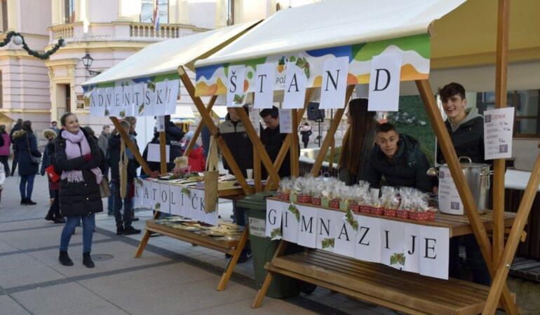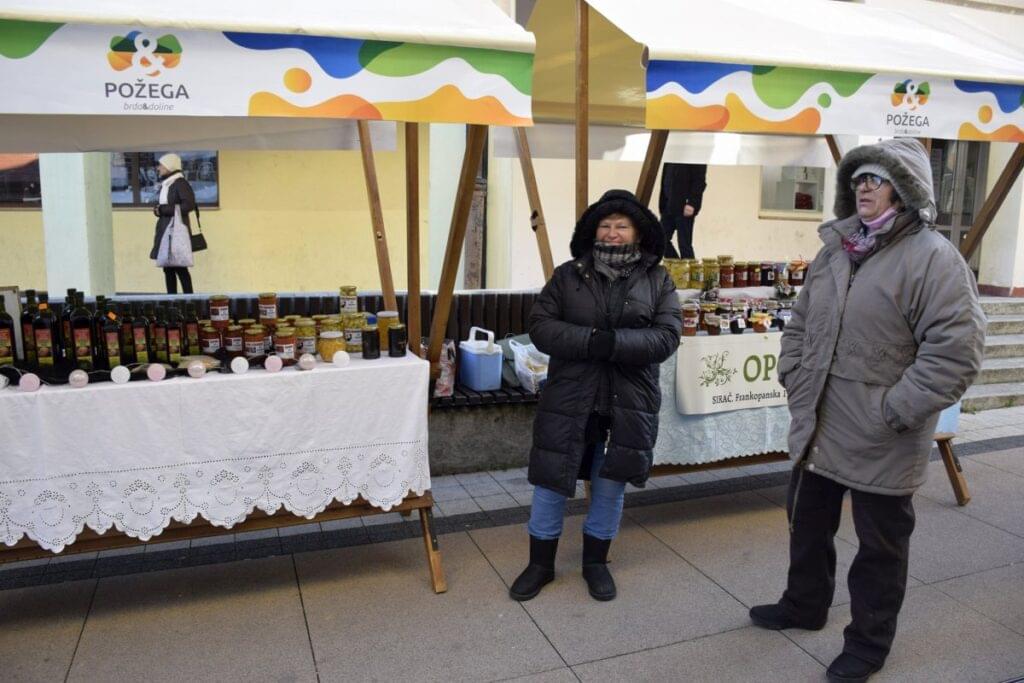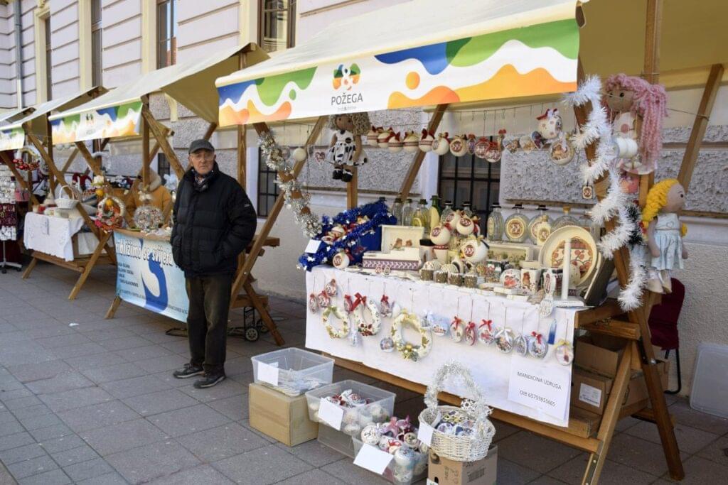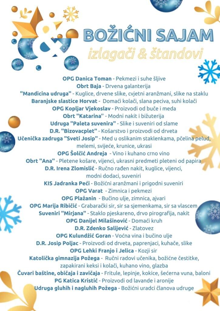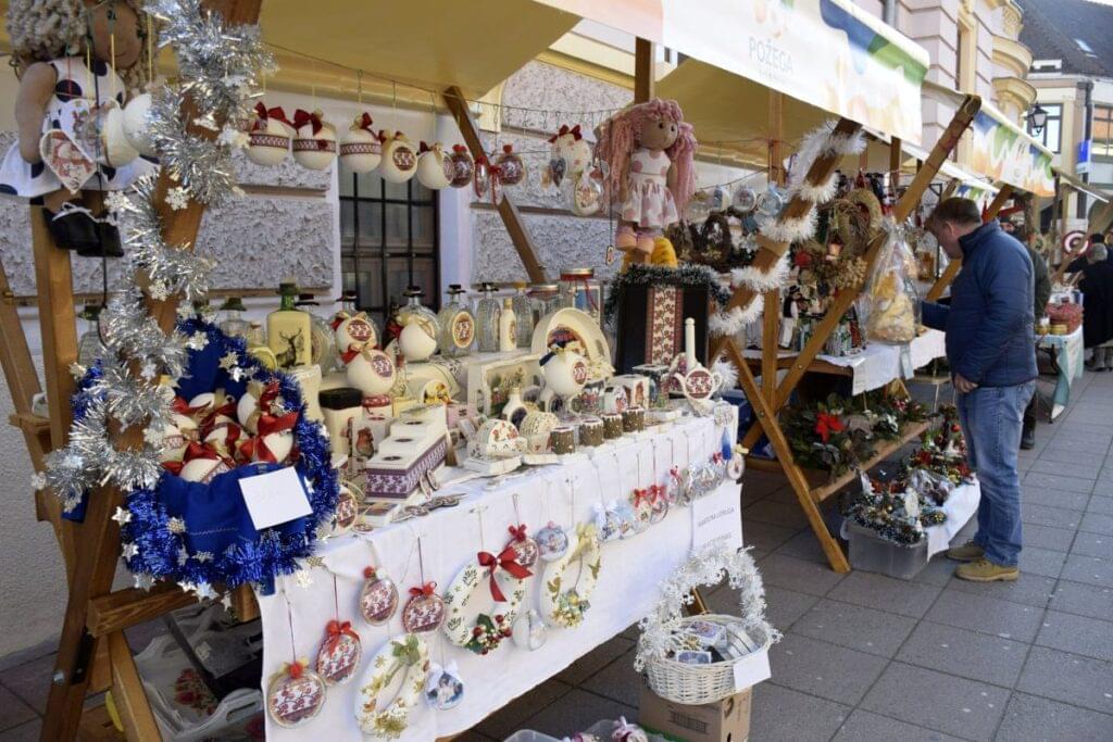 Prema riječima direktorice TU TZ Grada Požege Silvije Podoljak na ovogodišnjem Božićnom sajmu posjetitelje očekuje tridesetak izlagača s domaćim proizvodima, kolačima, božićnim nakitom, drvena galanterija, modni nakit i zlatovez te učeničke zadruge. U petak, 24. prosinca uz Božićni sajam od 10 do 12 sati u organizaciji Konjogojstvene udruge Vallis Aurea očekuje vas i adventska vožnja kočijom, a od 11 sati domjenak za građane u organizaciji Obrtničke komore Požega i Udruženje obrtnika, uz potporu Grada Požege i Turističke zajednice, kada će biti podijeljeno 1000 porcija perkelta od soma.