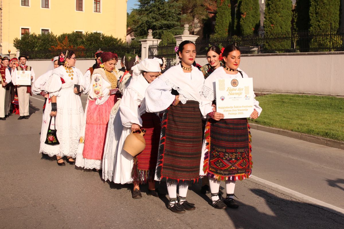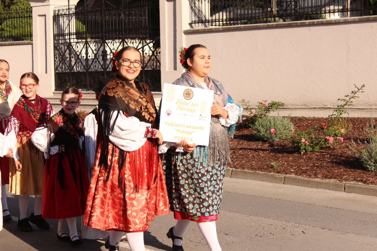 Svečana povorka prošla je ulicama Požege uz sudjelovanje lokalnih kulturno-umjetničkih društava, povijesnih postrojbi, konjogojskih udruga i drugih tradicionalnih sudionika. Po dolasku povorke na Trg Svetog Trojstva uslijedilo je će svečano otvorenje ovogodišnjih Zlatnih žica Slavonije i nastup domaćih KUD-ova. Vrhunac ovogodišnje folklorne večeri Zlatnih žica Slavonije je nastup dva eminentna folklorna ansambla iz različitih dijelova Hrvatske.