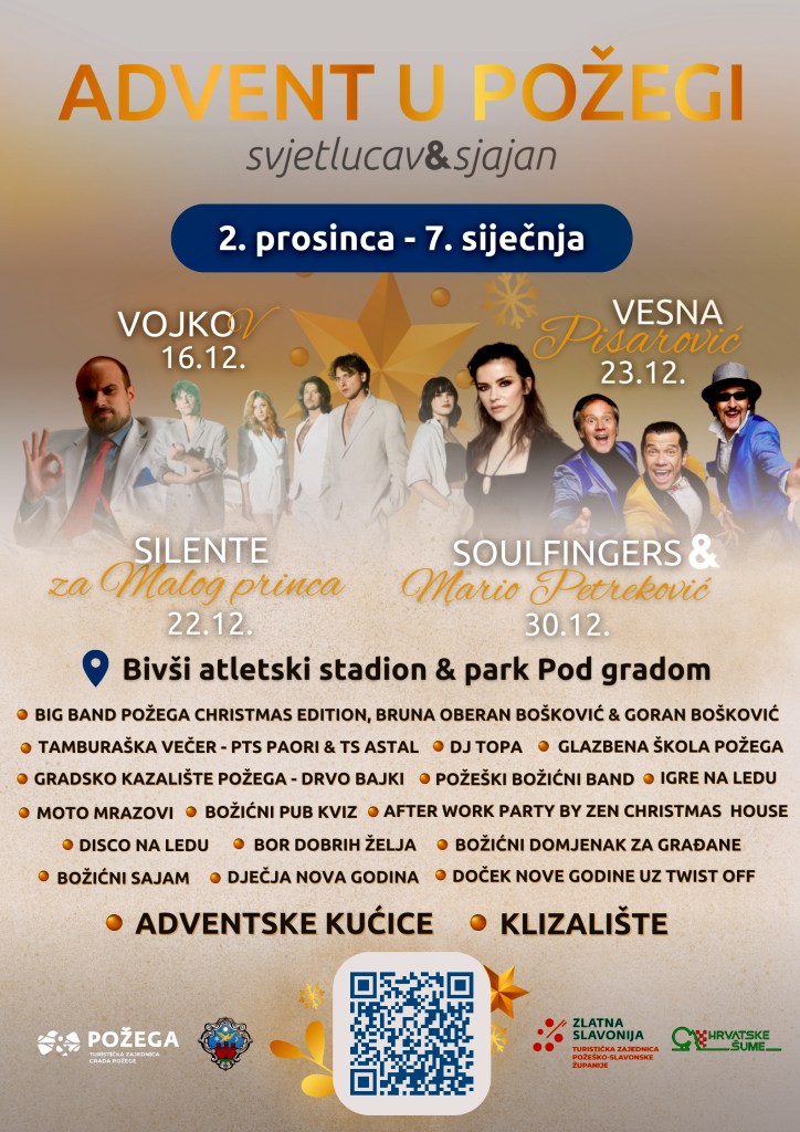 „Program 2. prosinca započinje na Trgu sv. Terezije paljenjem prve adventske svijeće nakon večernje mise. Nakon toga ćemo se uputiti do bivšeg atletskog stadiona, na kojemu će biti otvoreno klizalište uz nastup Plesnog studija Marine Mihelčić i Požeških mažoretkinja, uz glazbenicu Miu Raguž. Slijedi nastup najmlađih skupina Umjetničke organizacije Plesne radionice Ilijane Lončar, a potom će nastupiti Big band Požega Christmas edition pojačani Brunom Oberan Bošković, te pjevačem grupe Fluentes Goranom Boškovićem“.
