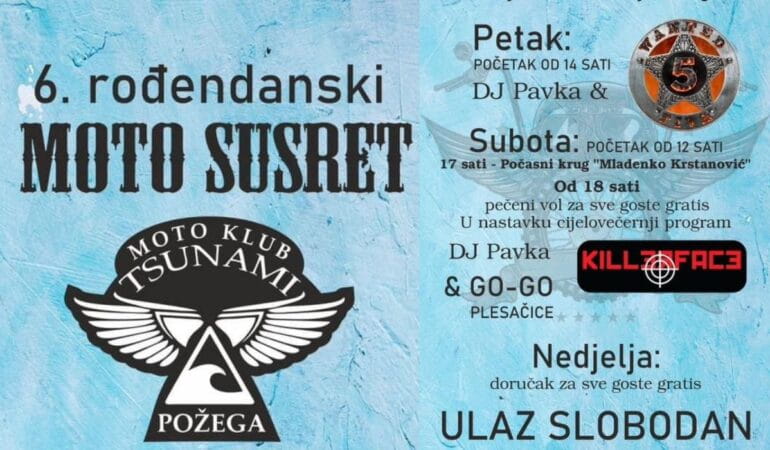 Moto Klub Tsunami poziva sve bajkere i sve ljubitelje motora na 6. Rođendanski Moto Susret na Motocross stazi Villare. Ovogodišnji Moto susret će se održati u novom terminu, od 19. do 21. svibnja, a taj termin će zadržati i za iduće susrete, dodali su.