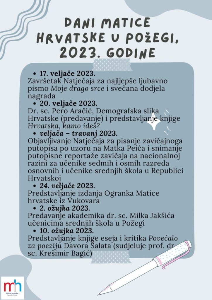 Predavanje je održano u sklopu Dana Matice hrvatske u Požegi, a više o aktivnostima koje provode rekla je Anita Katić, predsjednica Ogranka Matice hrvatske u Požegi prilikom gostovanja u emisiji “Jutro s Matkom“.