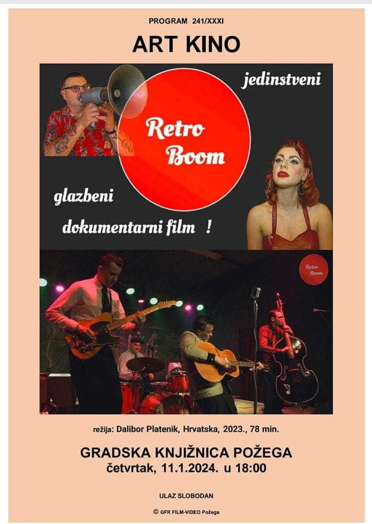Program ART kina Požega danas, 11. siječnja donosi projekciju višestruko nagrađivanog filma „Retro Boom“ u režiji Požežanina Dalibora Platenika. Projekcija filma započinje u 18 sati u Gradskoj knjižnici Požega, ulaz je slobodan.