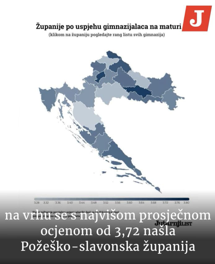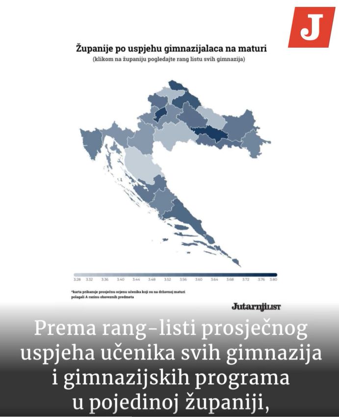Prema rang-listi prosječnog uspjeha učenika svih gimnazija i gimnazijskih programa u pojedinoj županiji, na vrhu se s najvišom prosječnom ocjenom od 3,72 našla Požeško-slavonska županija. Na drugom mjestu je Grad Zagreb s neznatno nižom ocjenom 3,70. U Zagrebu je na maturi višu razinu iz obaveznih predmeta polagalo više od 2500 gimnazijalaca, odnosno njih 75 posto. Na trećem je mjestu Međimurska županija, koja je godinama u vrhu rang lista kad je riječ o obrazovanju gimnazijalaca.