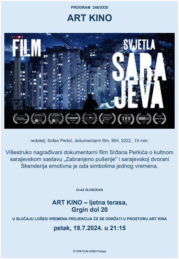 Ljetni program Art kina u Požegu donosi projekciju višestruko nagrađivanog dokumentarnog filma “Svjetla Sarajeva”. Projekcija će se održati u petak, 19. srpnja 2024. godine s početkom u 21,15 sati na terasi hotela Grgin dol u Požegi.