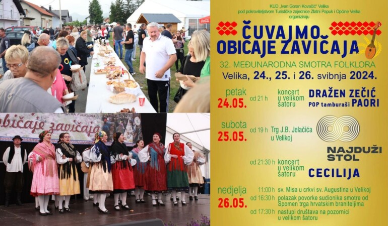 U svečanom mimohodu i nastupu na 32. Međunarodnoj smotri folklora „Čuvajmo običaje zavičaja” sudjeluju HKUD „Matija Gubec” Tavankut, HKUD „Dubrave” Aladinići, Hrvatska izvorna grupa Budimpešta, KUD „Klokotič” Rumunjska, RKUD „Rudar” Raša, KUD „Šijaci” Biškupci, KUD „Orljava” Pleternica, Češka beseda Kaptol, KUU „Miljevci”, KUD „Jasen“ Šaptinovci, KUD „Tomislav“ Sibinj, Dječji vrtić Velika, Veličke mažoretkinje i domaćini KUD „I.G.Kovačić” Velika.