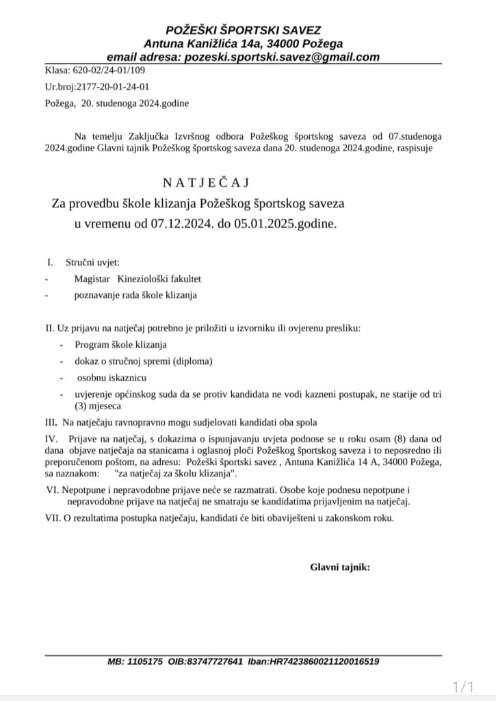 Na temelju zaključka Izvršnog odbora Požeškog športskog saveza od 7. studenog 2024. godine Glavni tajnik Požeškog športskog saveza dana 20. studenoga 2024 .godine, raspisuje Natječaj za provedbu škole klizanja Požeškog športskog saveza u vremenu od 7. prosinca 2024. do 5. siječnja 2025. godine.