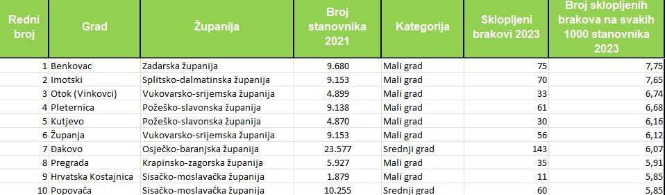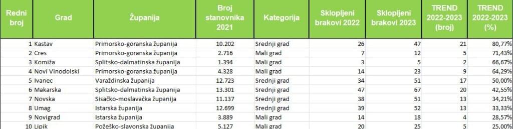 Najveći porast u broju sklopljenih brakova bilježe pak dva grada iz Primorsko-goranske županije – Kastav i Cres. U Kastvu, u kojem živi nešto više od 10 tisuća stanovnika lani su tako sklopljena 47 braka, za razliku od 26 u 2022. godini. Cres, pak, bilježi rast od 71,43% – lani je sklopljeno 12 brakova, pet više nego godinu ranije. Rast broja sklopljenih brakova od preko 50% bilježe, nadalje, Komiža, Novi Vinodolski i Ivanec, a u top 10 po povećanju broja sklopljenih brakova su još Makarska, Novska, Umag, Novigrad i Lipik.
