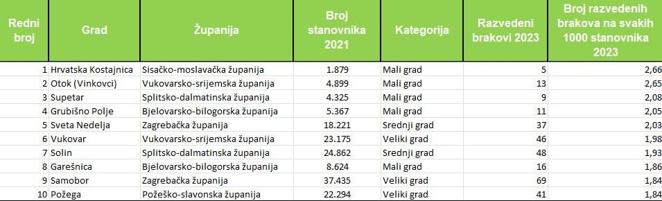 Kad gledamo apsolutne brojke, sličan je poredak i kad su u pitanju razvodi. Najviše ih je (opet kad izuzmemo Zagreb i tamošnja 922) bilo u Splitu, Osijeku, Velikoj Gorici, Zadru, Karlovcu, Samoboru, Varaždinu, Slavonskom Brodu, Sisku i Kaštelima. Gledano, pak, u odnosu na broj stanovnika, najviše razvoda – 2,66 i 2,65 na 1.000 stanovnika, bilo je u Hrvatskoj Kostajnici i Otoku. Slijede Supetar, Grubišno Polje, Sveta Nedjelja, Vukovar, Solin, Garešnica, Samobor i Požega.