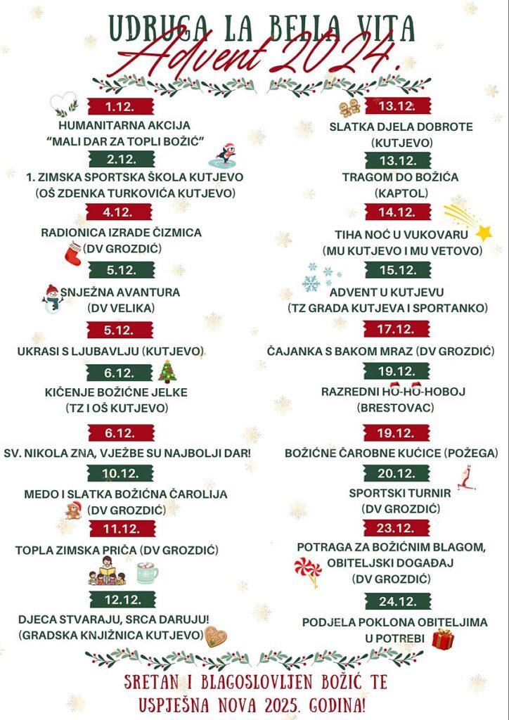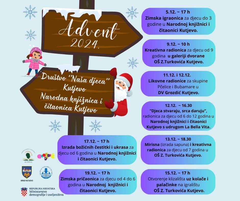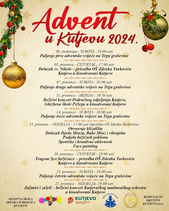 Dana 19. prosinca, učenici Osnovne škole Zdenka Turkovića izvest će priredbu pod nazivom „Tragom žice božićnice“. Advent se zaključuje uvijek svečanim i dirljivim božićnim koncertom Kutjevačkog tamburaškog orkestra pod nazivom „Zažmiri i zaželi“, koji će se održati 22. prosinca u Kinodvorani s početkom u 19 sati.