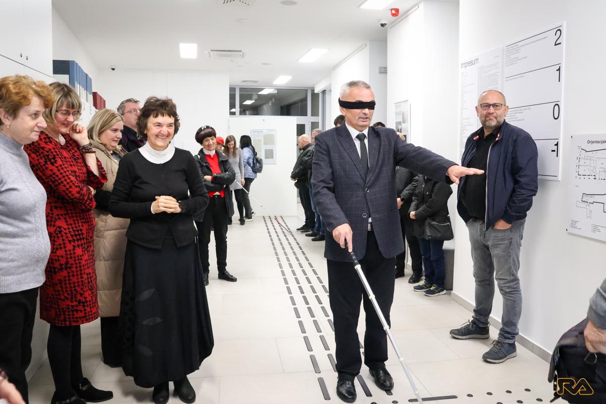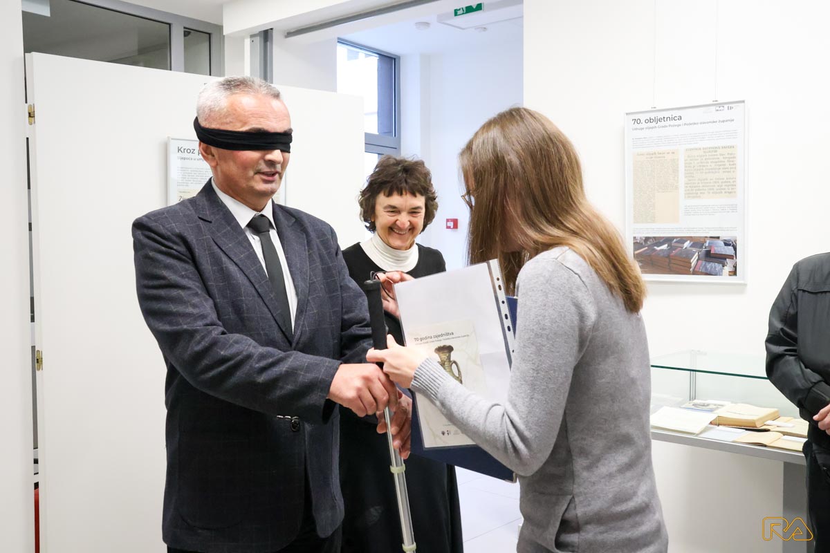 Izložbu je otvorio zamjenik gradonačelnika Grada Požege Borislav Miličević, pohvalivši trud i angažman u pripremi izložbe ovakvog značaja. Zatim je i sam iskusio kako je to proći izložbom kao slijepa osoba, zavezanih očiju i uz korištenje bijelog štapa i taktilnih traka koje su postavljene na podu muzeja.