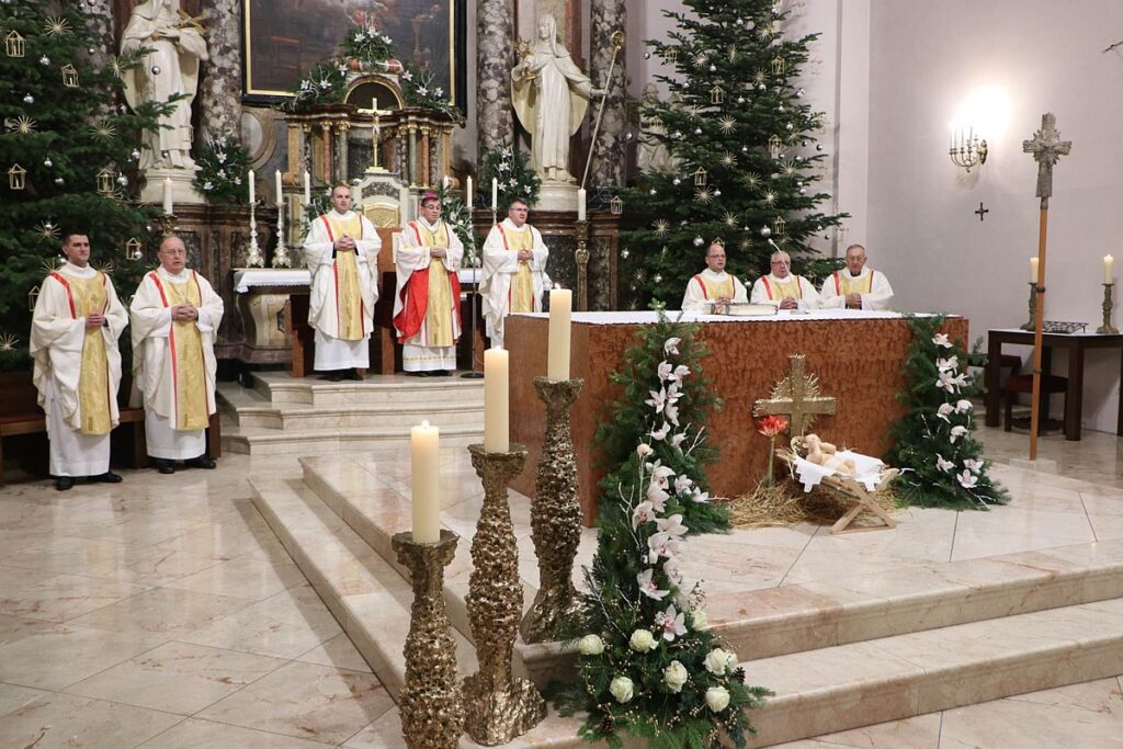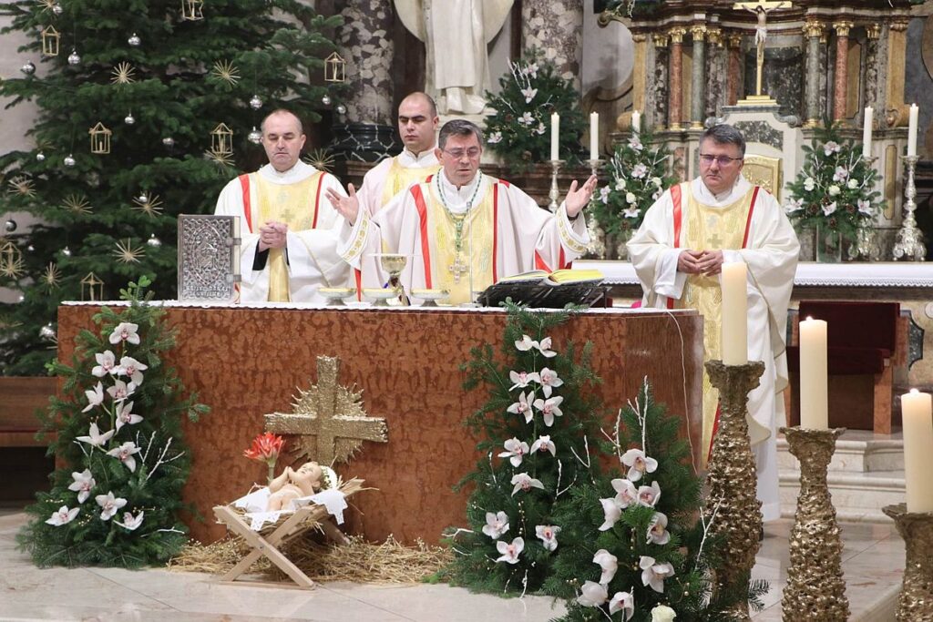 Na završetku svete mise biskup je u ime nazočnih kanonika i svećenika poželio čestit i blagoslovljen Božić svim nazočnima, kao i njihovim bližnjima u Domovini i po svijetu. „Pozdravite i čestitajte Božić bolesnima, starima i nemoćnima, osobito onima kojima je potrebna snaga ljubavi koja se očituje u vašoj prisutnosti. Neka nas Isus, novorođeni Bog kojem se danas radujemo, ojača da ne posustanemo u njegovoj ljubavi i vjeri, da budemo nositelji nade. Nada nikad ne postiđuje kao što ni Krist nikada ne postiđuje. Neka Krist koji je naše svjetlo i nada, koji je obasjao svijet i čovječanstvo svojim dolaskom, pomogne da ga slijedimo i uvijek budemo oslonjeni na njega. U zajedništvu s njim hrabro naviještajmo njegovu ljubav koja nas vodi ne samo do oltara i zajedništva u proslavi Božića, nego koja nas usmjerava prema nebu“, zaključio je biskup te na sve zazvao Božji blagoslov.