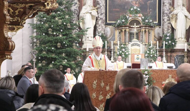 Na početku homilije biskup je kazao kako u Božiću slavimo otajstvo spasenja koje je Bog darovao i u koje nas uvodi po Isusovom rođenju. „Otajstvo spasenja i svoje prisutnosti Bog je ostvarivao kroz cijelu povijest spasenja. Današnja riječ Božja želi nas na to podsjetiti i potaknuti da s vjerom, osjećajima, razumom i srcem uđemo u to otajstvo Božje objave, darivanja i dolaska u povijest spasenja i u naše živote.“ Osvrnuo se zatim na prvo čitanje iz Knjige proroka Izaije koji izraelskom narodu u nevolji i tragediji navješćuje radost, mir i bolju budućnost „Prorok narodu u ropstvu i tuđini govori o radosti i ljepoti koju će Bog ostvariti. Sigurno da su se mnogi od njegovih slušatelja čudili se onome što po Božjem nadahnuću naviješta. Možda se slično događa i nama kada smo u teškoj životnoj stvarnosti, kad ne vidimo izlaz iz svojih poteškoća. Tada nam je neobično da nam netko govori kako će biti bolje i da se treba osloniti na Boga i ne gubiti vjeru. Mnogi se nažalost u takvim stvarnostima udalje od Boga jer očekuju da Bog treba odmah djelovati. Takvi smo mi ljudi. Mi smo naučili da se sve što danas zamislimo, da se treba odmah ostvariti, a kod Boga je drugačije, on drugačije djeluje. Prorok Izaija nije dočekao ono što je naviještao, a nisu ni drugi proroci“, zaključio je biskup.