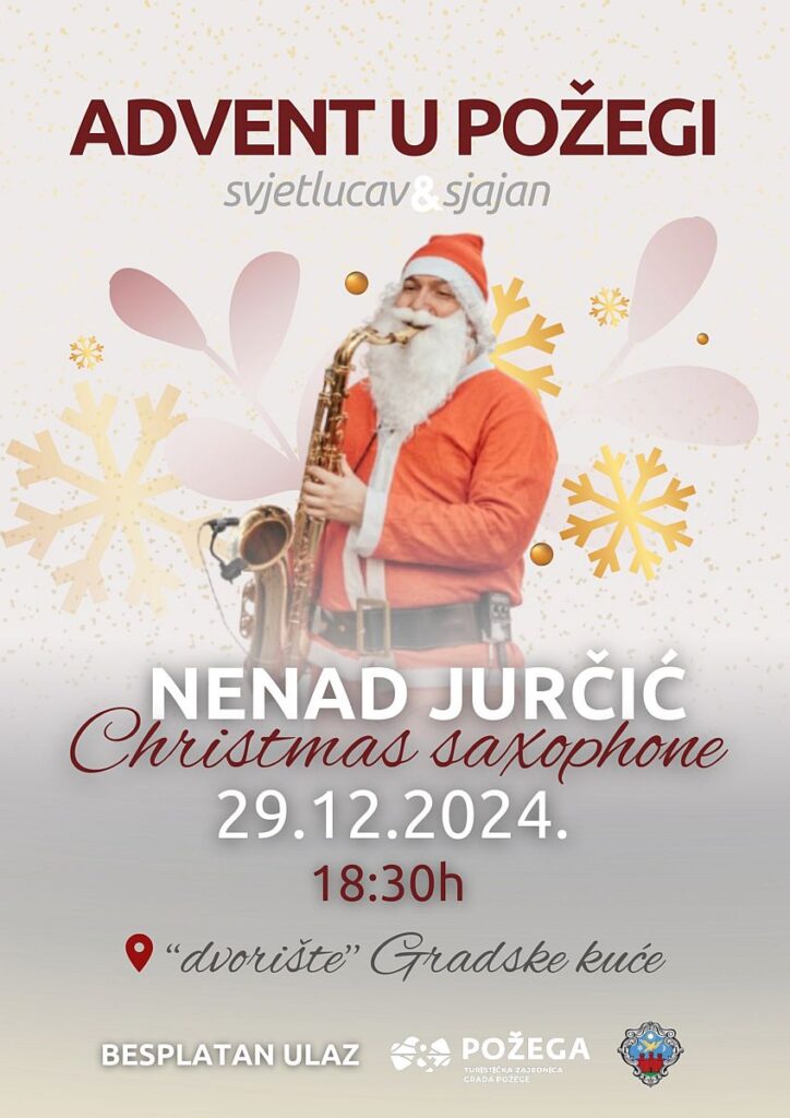 Atmosferu će 29. prosinca održavati Nenad Jurčić & Christmas saxophone, što nas dovodi i do dočeka Nove godine. Prethodno dočeku za „odrasle“ održat će se dječji doček u 18,00 sati. Novost je doček za šapice, koji će se održati u 17,00 sati uz promociju kalendara nastalog u suradnji Javne vatrogasne postrojbe Grada Požege, Turističke zajednice Grada Požege i Udruge za zaštitu životinja Sirius.