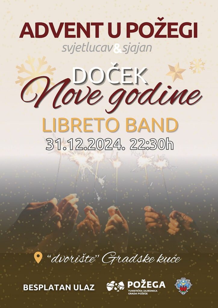 Doček Nove godine od 22,30 sati bit će uz Libreto band. Početak nove godine, 1. siječnja, provest ćemo na Adventu uz Ivana Štivića i Slavonski vez.