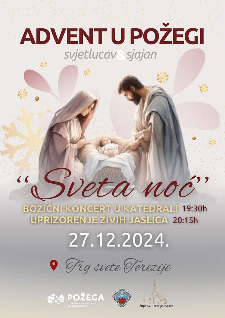 U petak, 27. prosinca također će se održati tradicionalni Božićni koncert u požeškoj Katedrali, u 19,30 sati, te će nakon koncerta biti uprizorenje živih jaslica na Trgu svete Terezije.