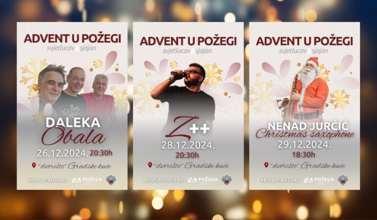 Nakon strašne tragedije koja se dogodila u Osnovnoj školi Prečko i proglašenja 21. prosinca danom žalosti, koncerti i događanja u sklopu Adventa u Požegi nisu održani. Neki od njih dobili su novi termin, a sve to nam slijedi u nastavku tjedna kad se približavamo dočeku Nove godine.