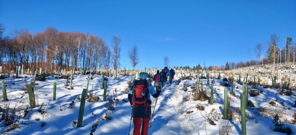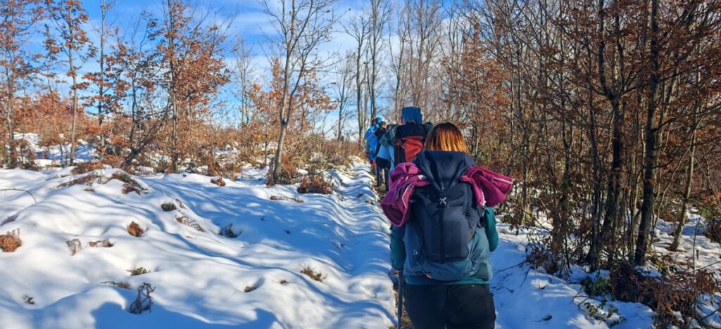 Nakon toga domaći vodiči su ih poveli na pohod, preko Starog Veličkog grada, Tauberovih stijena, vrha Lapjak do Anđine baraka i mjesta gdje se danas nalazi spomenik poginulim braniteljima. Šetnja je potrajala nepuna tri sata po snježnom i blatnom terenu, a po dolasku na odredište planinari su zapalili lampione i pomoli se za poginule.