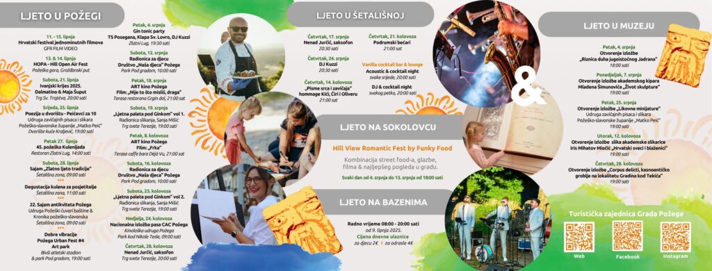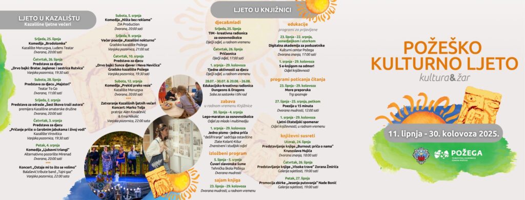 U nastavku Požeškog kulturnog ljeta čeka nas još mnoštvo programa – koncerti, predstave pod zvijezdama, kvizovi, likovne radionice, izlasci na Sokolovac i još mnogo toga. Cijeli program donosimo u nastavku.
