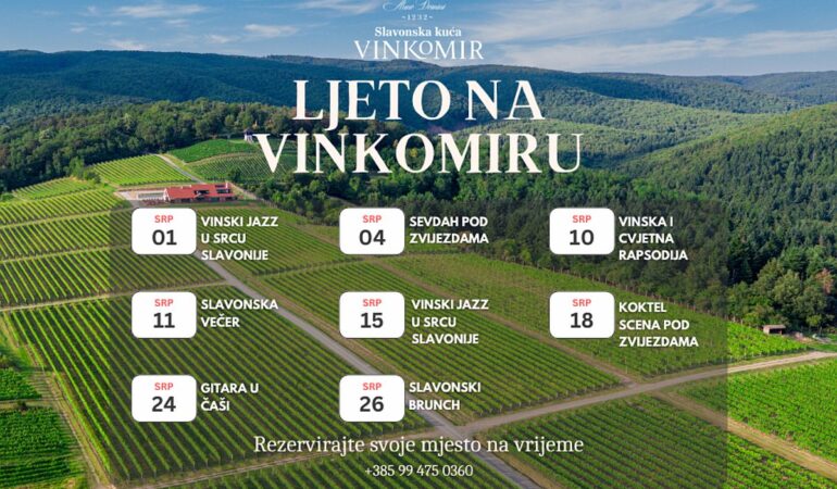 Prema srpanjskom rasporedu, ljetna događanja na Vinkomiru započinju u utorak, 1. srpnja uz Vinski jazz u srcu Slavonije, večer koja spaja note jazza i kutjevačka vina u intimnom ambijentu vinograda. Već u petak, 4. srpnja slijedi emotivna glazbena večer Sevdah pod zvjezdama, dok nas 10. srpnja, u četvrtak, očekuje Vinska i cvjetna rapsodija, doživljaj za sva osjetila.