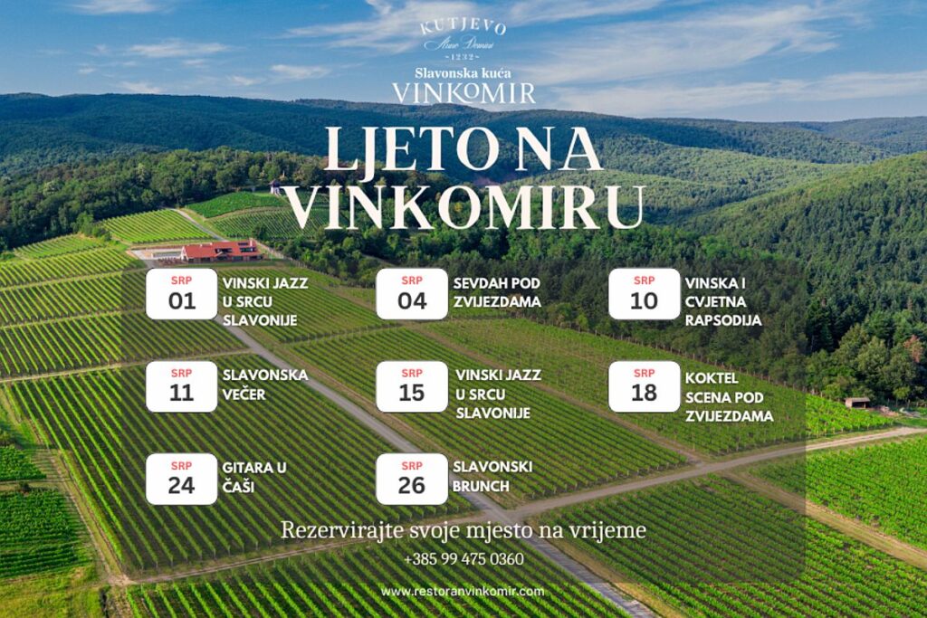 Prema srpanjskom rasporedu, ljetna događanja na Vinkomiru započinju u utorak, 1. srpnja uz Vinski jazz u srcu Slavonije, večer koja spaja note jazza i kutjevačka vina u intimnom ambijentu vinograda. Već u petak, 4. srpnja slijedi emotivna glazbena večer Sevdah pod zvjezdama, dok nas 10. srpnja, u četvrtak, očekuje Vinska i cvjetna rapsodija, doživljaj za sva osjetila.