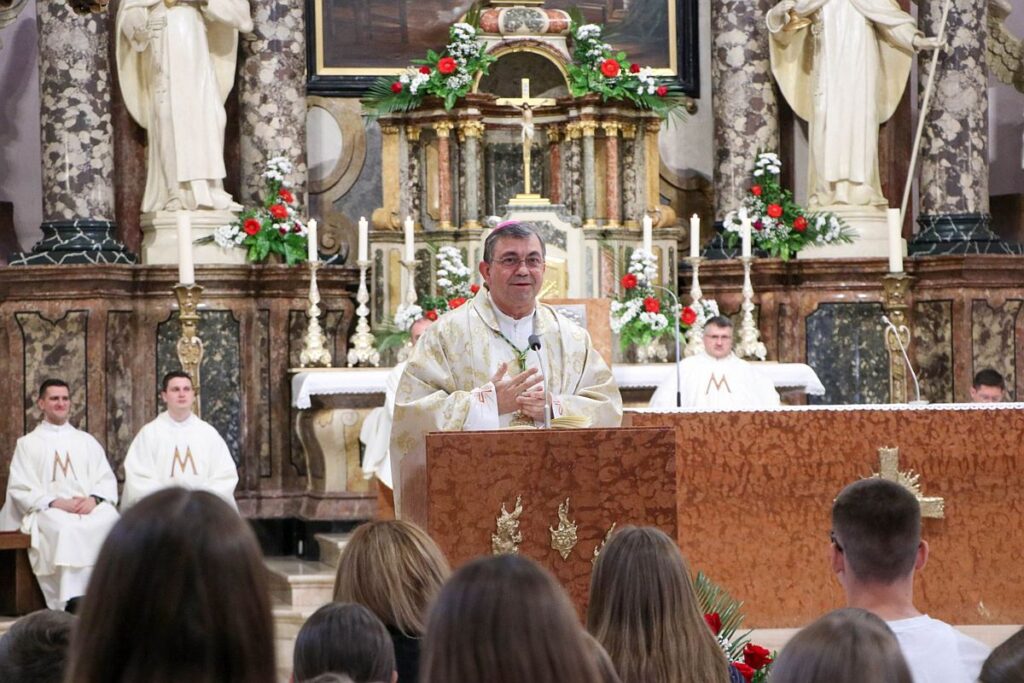 Pozdravljajući nazočne svećenike, ravnatelje, vjeroučitelje, učenike i djelatnike požeških osnovnih i srednjih škola, biskup ih je pozvao da u euharistijskom slavlju zahvale Bogu za mnoge darove i dobročinstva koja su primili u protekloj nastavnoj godini. Pozvao je učenike da zahvale za darovani rast i napredak u znanju i odgoju koji Bog ostvaruje po njihovim učiteljima, roditeljima, ali i međusobnim odnosima. Podsjetio ih je kako Crkva danas slavi blagdan Blažene Djevice Marije – Majke Crkve: „Marija je naša duhovna majka koja nas uvijek usmjerava na svoga Sina. Lijepo je imati Isusovu majku za svoju duhovnu i nebesku majku“, poručio je biskup preporučivši Marijinu zagovoru sve potrebe nazočnih učenika i djelatnika škola.
