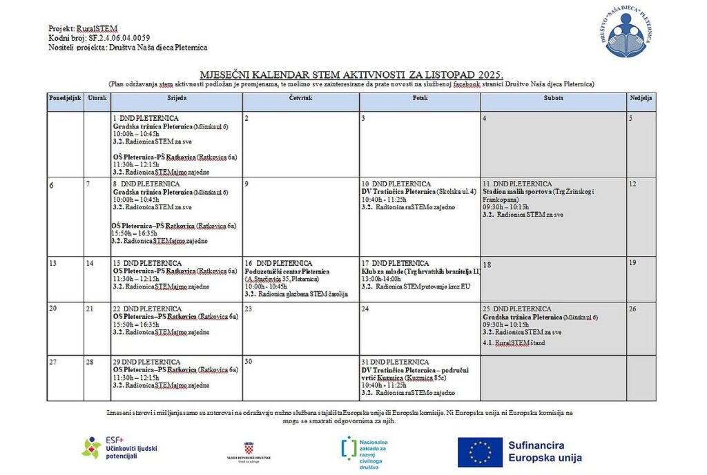 Dragi ljubitelji STEM-a u listopadu se nastavljaju STEM radionice u okviru projekta „RuralSTEM“. Uključite svoje mališane u nezaboravno iskustvo učenja kroz igru gdje se znatiželja pretvara u iskustvo, upoznaje znanost, eksperimentira i doznaje kako STEM rješava probleme svakodnevice.