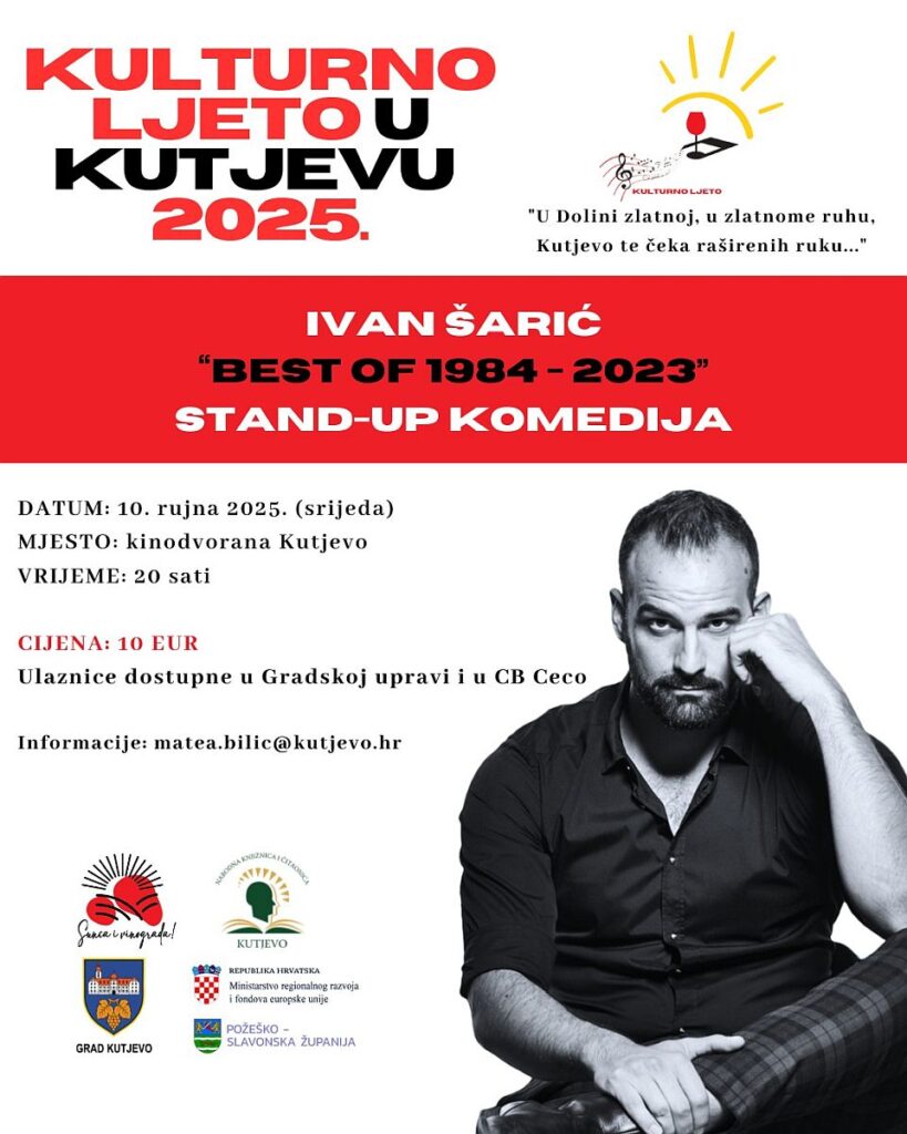 Kulturno ljeto u Kutjevu 2025. donosi večer smijeha i dobre zabave! U srijedu, 10. rujna 2025., u Kinodvorani Kutjevo s početkom u 20,00 sati nastupa poznati stand-up komičar Ivan Šarić sa svojim programom “Best of 1984 – 2023”. Publika će imati priliku uživati u njegovim najboljim forama i nastupima koji su obilježili njegovu dosadašnju karijeru.