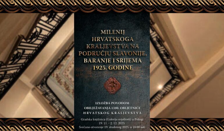 Povodom obilježavanja 1100. obljetnice Hrvatskoga Kraljevstva, u srijedu 19. studenoga 2025. godine u 18 sati, u Gradskoj knjižnici Požega na Galeriji svjetlosti održat će se svečano otvorenje izložbe pod nazivom Milenij Hrvatskoga Kraljevstva na području Slavonije, Baranje i Srijema 1925. godine.