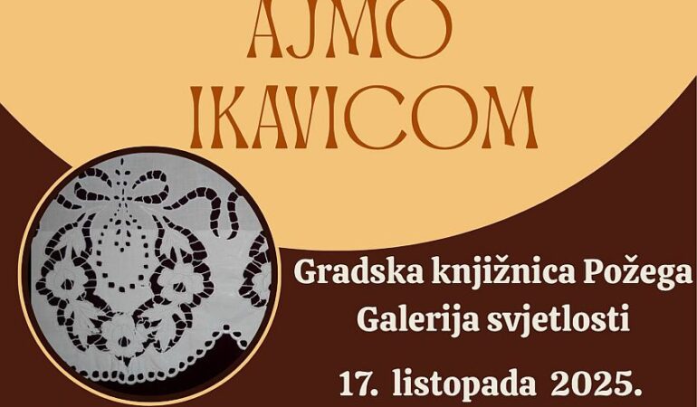 Udruga zavičajnih pisaca i slikara Požeško-slavonske županije „Matko Peić“ poziva sve ljubitelje pisane riječi i glazbe na literarno-glazbenu manifestaciju „Ajmo ikavicom“, koja će se održati u petak, 17. listopada 2025. godine, s početkom u 17,30 sati na Galeriji svjetlosti Gradske knjižnice Požega.