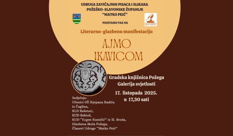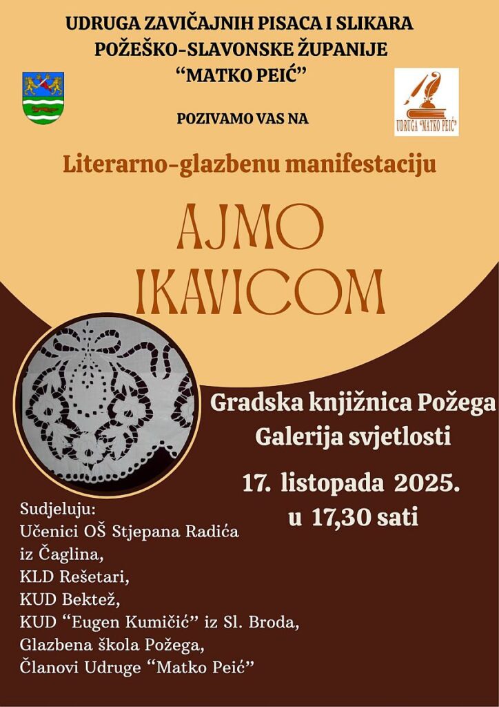 Udruga zavičajnih pisaca i slikara Požeško-slavonske županije „Matko Peić“ poziva sve ljubitelje pisane riječi i glazbe na literarno-glazbenu manifestaciju „Ajmo ikavicom“, koja će se održati u petak, 17. listopada 2025. godine, s početkom u 17,30 sati na Galeriji svjetlosti Gradske knjižnice Požega.
