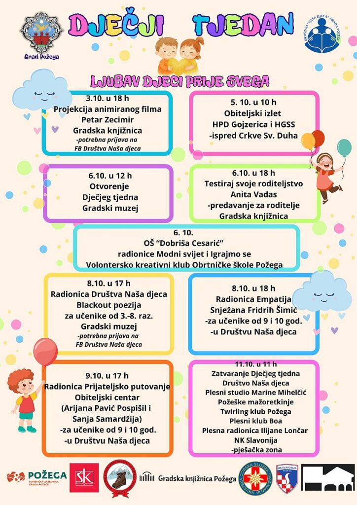 Od 3. do 11. listopada u Požegi će se obilježiti Dječji tjedan, tradicionalna manifestacija posvećena djeci i njihovim pravima, ove godine pod geslom „Ljubav djeci prije svega“. Dječji tjedan je tradicionalna godišnja manifestacija Saveza društava „Naša djeca“ na državnoj razini i na razini lokalnih Društava u gradovima i općinama, posvećena djeci, a provodi se od 1953. godine.