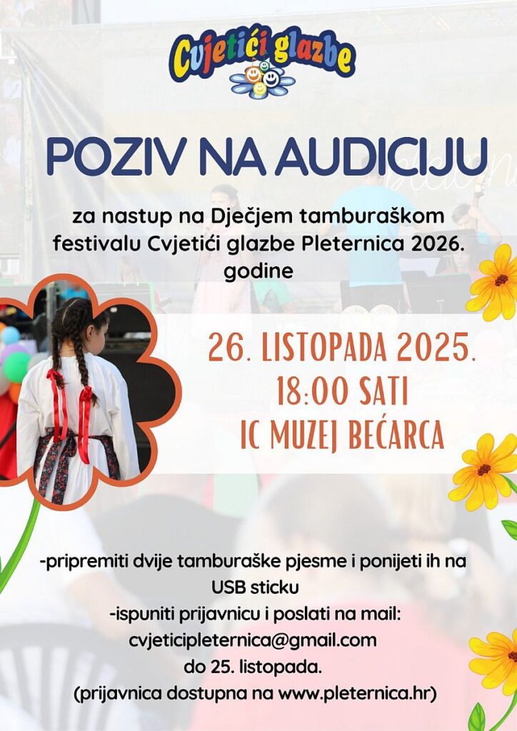 Otvoreni poziv na audiciju za nove sudionike festivala Cvjetići glazbe održat će se u nedjelju, 26. listopada u 18 sati, u dvorani Muzeja bećarca.