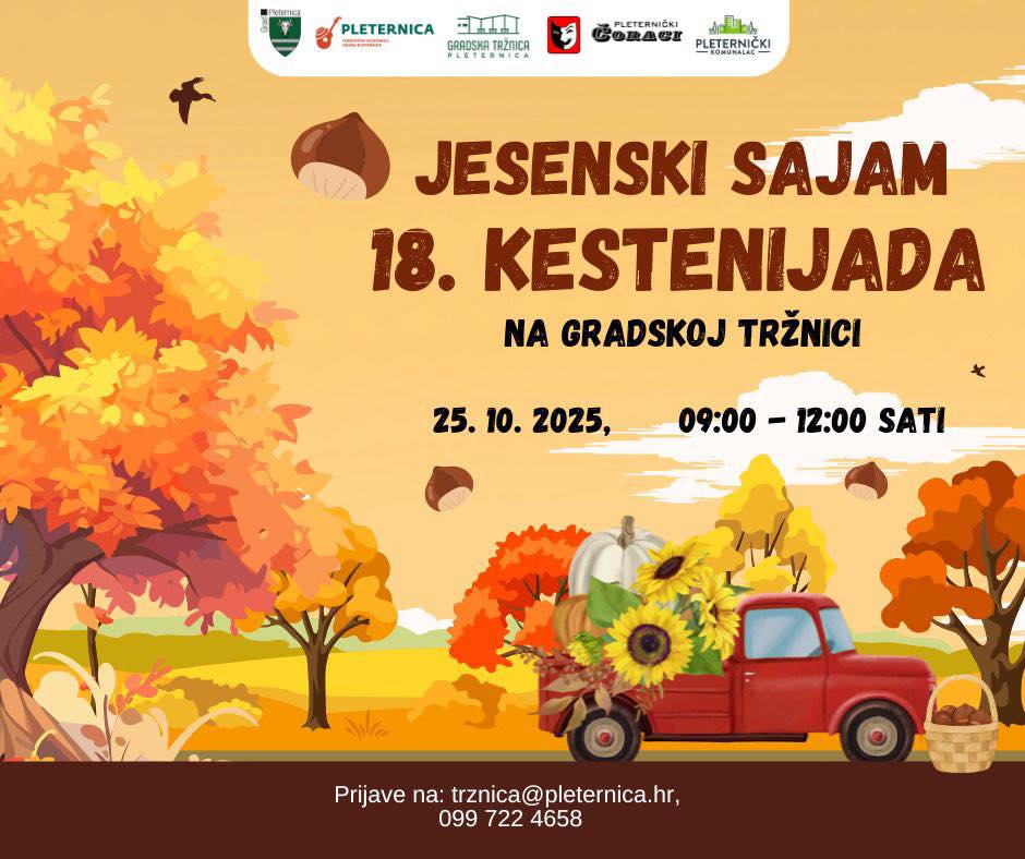 Pleternica ovih dana živi u ritmu jeseni – miris pečenih kestena, domaćih delicija i glazbe ponovno će ispuniti gradske ulice i tržnicu. U subotu, 25. listopada, održat će se 18. Kestenijada, tradicionalna manifestacija koja već gotovo dva desetljeća okuplja brojne posjetitelje, izlagače, udruge i ljubitelje jesenskih okusa. U emisiji „Jutro s Matkom“ gostovala je direktorica Turističke zajednice grada Pleternice, Ivana Ketović Marjanović istaknuvši kako je listopad u Pleternici posebno bogat događanjima i aktivnostima.
