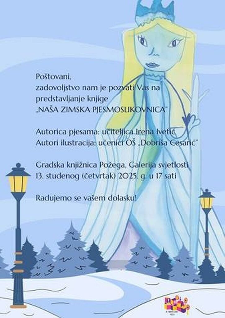 Gradska knjižnica Požega domaćin je predstavljanja knjige „Naša zimska pjesmolikovnica“, koje će se održati u četvrtak, 13. studenoga na Galeriji svjetlosti u 17,00 sati.