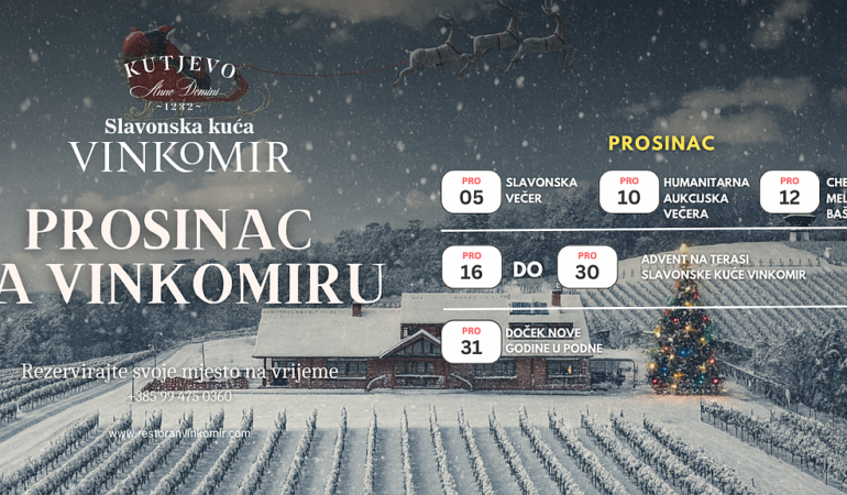 Restoran Slavonska kuća Vinkomir ovog prosinca donosi bogati program koji će kraj godine pretvoriti u nezaboravno slavonsko hedonističko iskustvo. Ovog prosinca na Vinkomiru očekuju vas tematske večeri, humanitarni događaj, gostovanje jednog od najpoznatijih hrvatskih chefova, Melkiora Bašića, te blagdanski adventski ugođaj uz vrhunac programa koji donosi tradicionalni doček Nove godine u podne. Prosinac u Slavonskoj kući Vinkomir tako postaje središte okupljanja, vrhunske gastronomije i vinskih doživljaja u srcu kutjevačkog vinogorja.