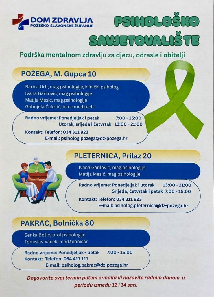 U prostoru Doma zdravlja Požeško-slavonske županije, od danas je službeno otvoreno Psihološko savjetovalište koje će djelovati na tri lokacije u županiji. Otvorenjem savjetovališta započinje provedba Posebnog programa osnaživanja mentalnog zdravlja, pokrenutog od strane Ministarstva zdravstva Republike Hrvatske, u suradnji s Hrvatskim zavodom za zdravstveno osiguranje i domovima zdravlja diljem Hrvatske.