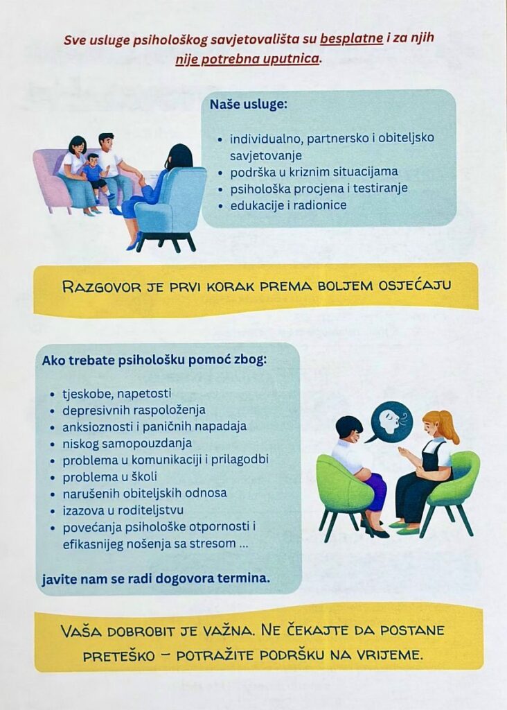 Voditeljica psihološke djelatnosti, klinički psiholog Barica Urh objasnila je kako usluge uključuju individualno, partnersko i obiteljsko savjetovanje, podršku u kriznim situacijama, psihološku procjenu i testiranje te edukaciju i radionice. Više informacija o vremenskim terminima pronađite na plakatu u nastavku.