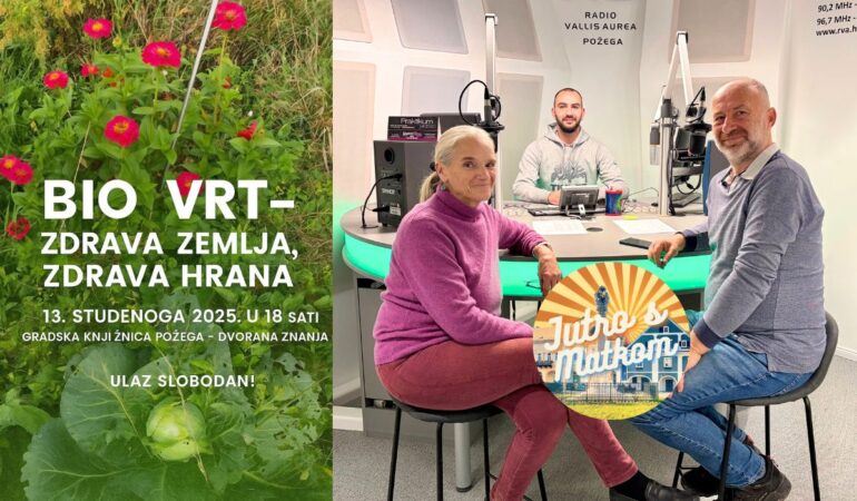 Ovog četvrtka u emisiji “Jutro s Matkom” najavili smo zanimljivo otvoreno predavanje koje se održava danas u organizaciji Grupe građana „Živa zemlja u našim vrtovima = zdrava hrana“ i Ekološke udruge Urbano zeleni laik. Gosti, mr. sc. Ivica Šnajder i Trudi Boršoš, otkrili su o čemu će govoriti na predavanju, o prirodnim načinima uzgoja biljaka, očuvanju plodnosti tla i važnosti malčiranja.
