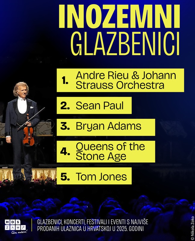 Listu najprodavanijih inozemnih koncerata preuzeli su Andre Rieu & Johann Strauss Orchestra, napunivši Arenu Zagreb drugu godinu zaredom. Prije održavanja koncerta u 2025., a nakon objave da je koncert rasprodan, zakazan je novi datum u Areni 2026., pa bi slavni violinist mogao zauzeti svoje mjesto na listi Bestsellera i sljedeće godine.