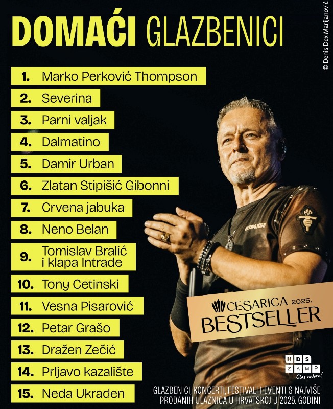 Prema službenim podacima HDS ZAMP-a, izvođač za čije je samostalne koncerte prodano najviše ulaznica u Hrvatskoj u 2025. godini je Marko Perković Thompson, čime je osvojio titulu Cesarica koncertnog Bestsellera. Riječ je o četvrtom izdanju ove liste, koja se proteklih godina profilirala kao najrelevantniji pokazatelj stvarne koncertne popularnosti izvođača, odnosno one koja se mjeri isključivo publikom i prodanim ulaznicama. Glazbena scena u Hrvatskoj posljednjih godina bilježi snažan uzlet, a podaci upućuju na to da je 2025. godina ponovo oborila rekorde koncertne industrije.