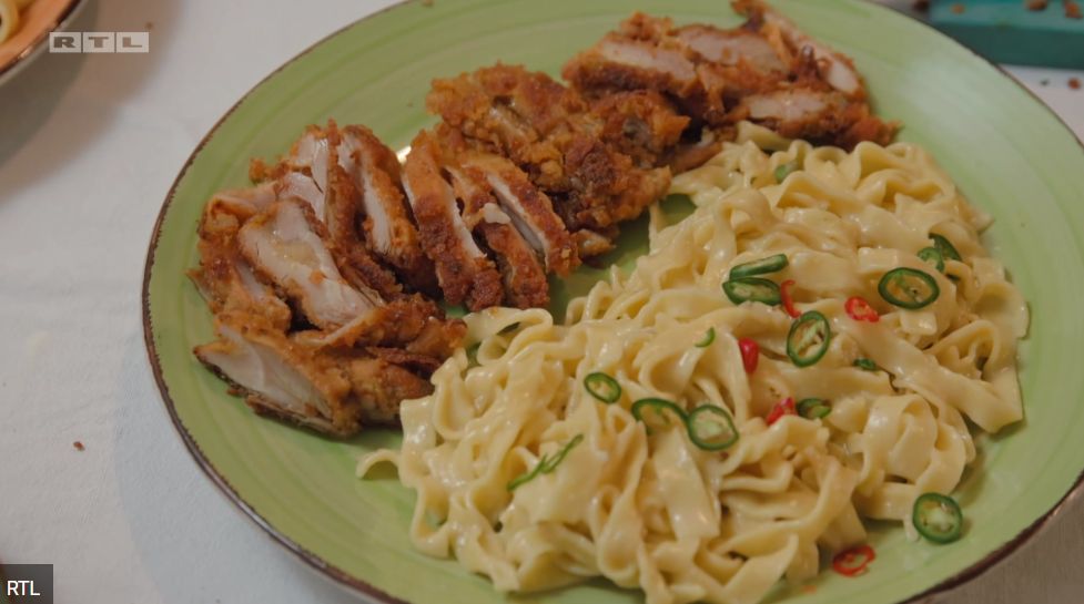 Za glavno jelo pripremila je domaće široke rezance s umakom od sira, pohanom piletinom i pečenim paprikama, a Franjo je komentirao kako se puno sastojaka ponavlja iz prethodnih jela.