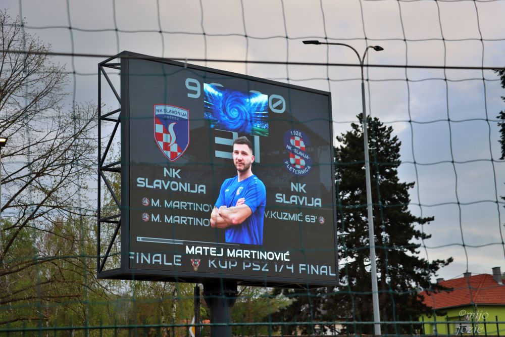 Na novootvorenom stadionu Nogometnog kluba Slavonija u Požegi odigrana je utakmica četvrtfinala Županijskog nogometnog kupa Požeško-slavonske županije u kojoj je domaća momčad upisala pobjedu protiv NK Slavije iz Pleternice rezultatom 3:1 te izborila plasman u polufinale.