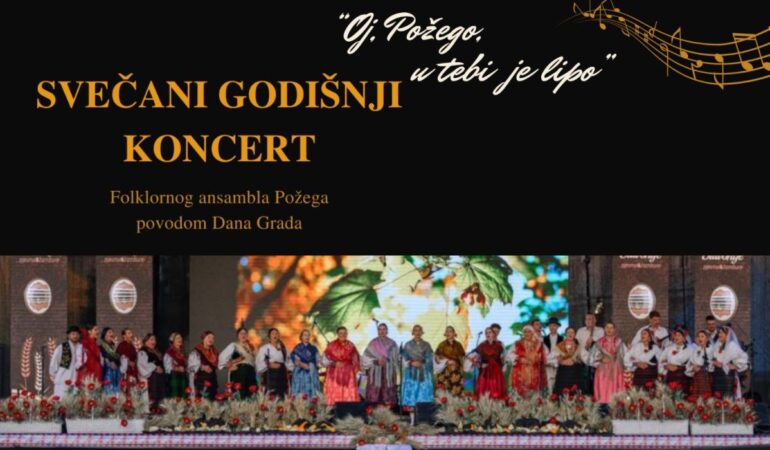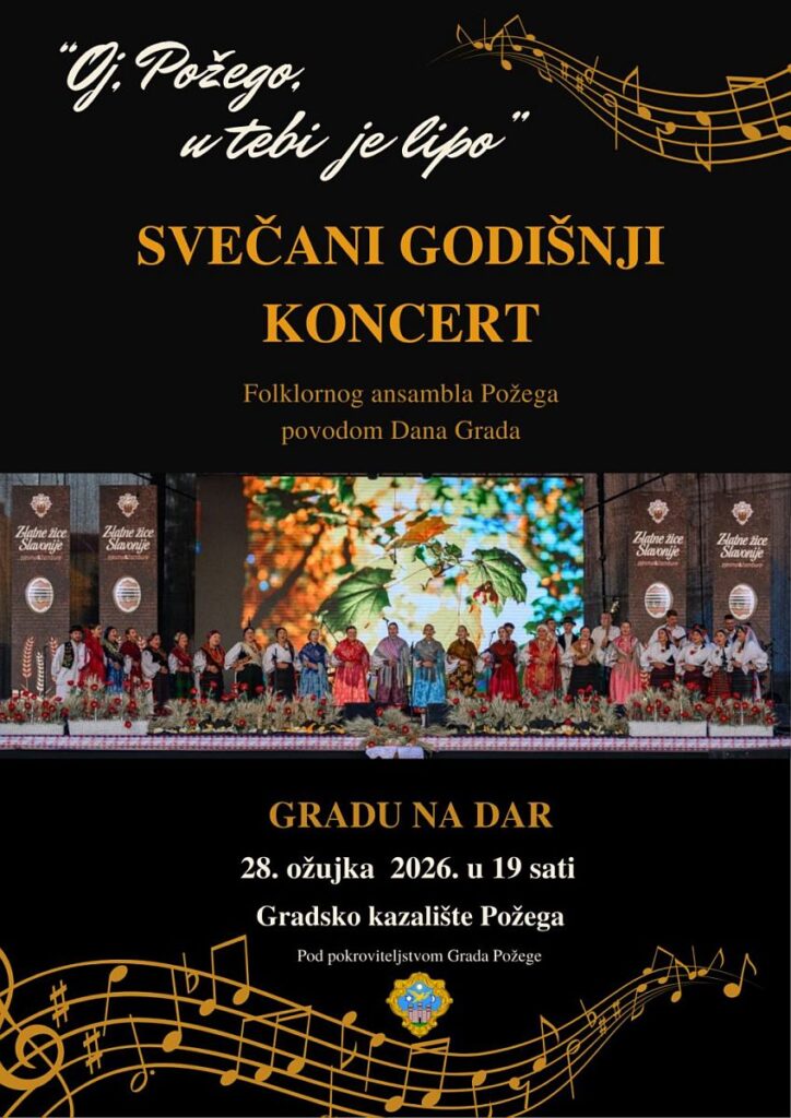 Folklorni ansambl Požega organizira svečani godišnji koncert pod nazivom „Oj, Požego, u tebi je lipo“, koji će se održati u Gradskom kazalištu Požega u subotu, 28. ožujka 2026. godine s početkom u 19,00 sati.