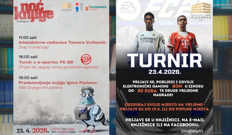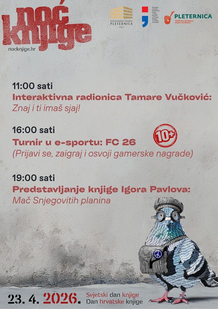 U Noć knjige, nacionalnoj kulturnoj manifestaciji koja se od 2012. godine održava diljem Hrvatske, i ove će se godine bogatim programom uključiti Hrvatska knjižnica i čitaonica Pleternica.