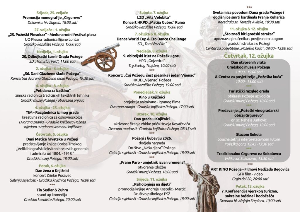 Proslava Dana grada Požege i Grgureva jedno je od najautentičnijih i najvažnijih kulturnih obilježja grada, duboko ukorijenjeno u povijesnoj i zajedničkom sjećanju Požežana. Program obilježavanja odvija se tijekom cijelog mjeseca ožujka, a u njegovu provedbu svojim su aktivnostima uključene brojne gradske ustanove i udruge koje svojim djelovanjem doprinose bogatstvu i raznolikosti kulturnog i društvenog života grada. Na današnjoj tiskovnoj konferenciji, program je najavila direktorica Turističke zajednice Grada Požege, Mirna Šimunović Svoboda, dok je gradonačelnik Grada Požege, Borislav Miličević, uputio poziv sugrađanima i gostima grada da se pridruže ovogodišnjem obilježavanju.