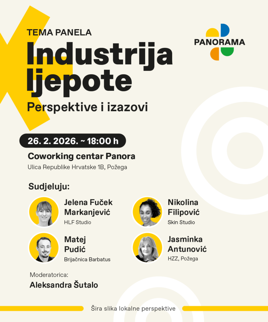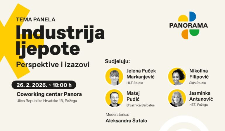Industrija ljepote u Požegi – perspektive i izazovi, tema je sljedeće Panorame koja se održava 26. veljače 2026. godine u 18 sati u Coworking centru Panora, a u panelu sudjeluju Jelena Fuček Markanjević (HLF Studio), Nikolina Filipović (Skin Studio), Matej Pudić (brijačnica Barbatus) i Jasminka Antunović (HZZ, Požega).