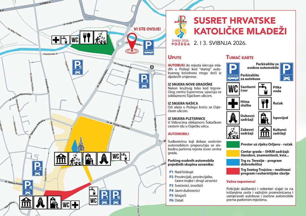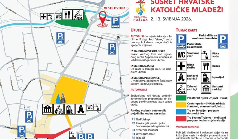 Povodom održavanja Susreta hrvatske katoličke mladeži (SHKM) u Požegi, a radi osiguranja sigurnosti sudionika i nesmetane organizacije događaja, iz Požeške biskupije obavijestili su o privremenoj posebnoj regulaciji prometa koja se provodi uz odobrenje Grada Požege i Policijske uprave Požeško-slavonske. Ljubazno mole građane grada Požege za razumijevanje i strpljenje tijekom trajanja ovih mjera.